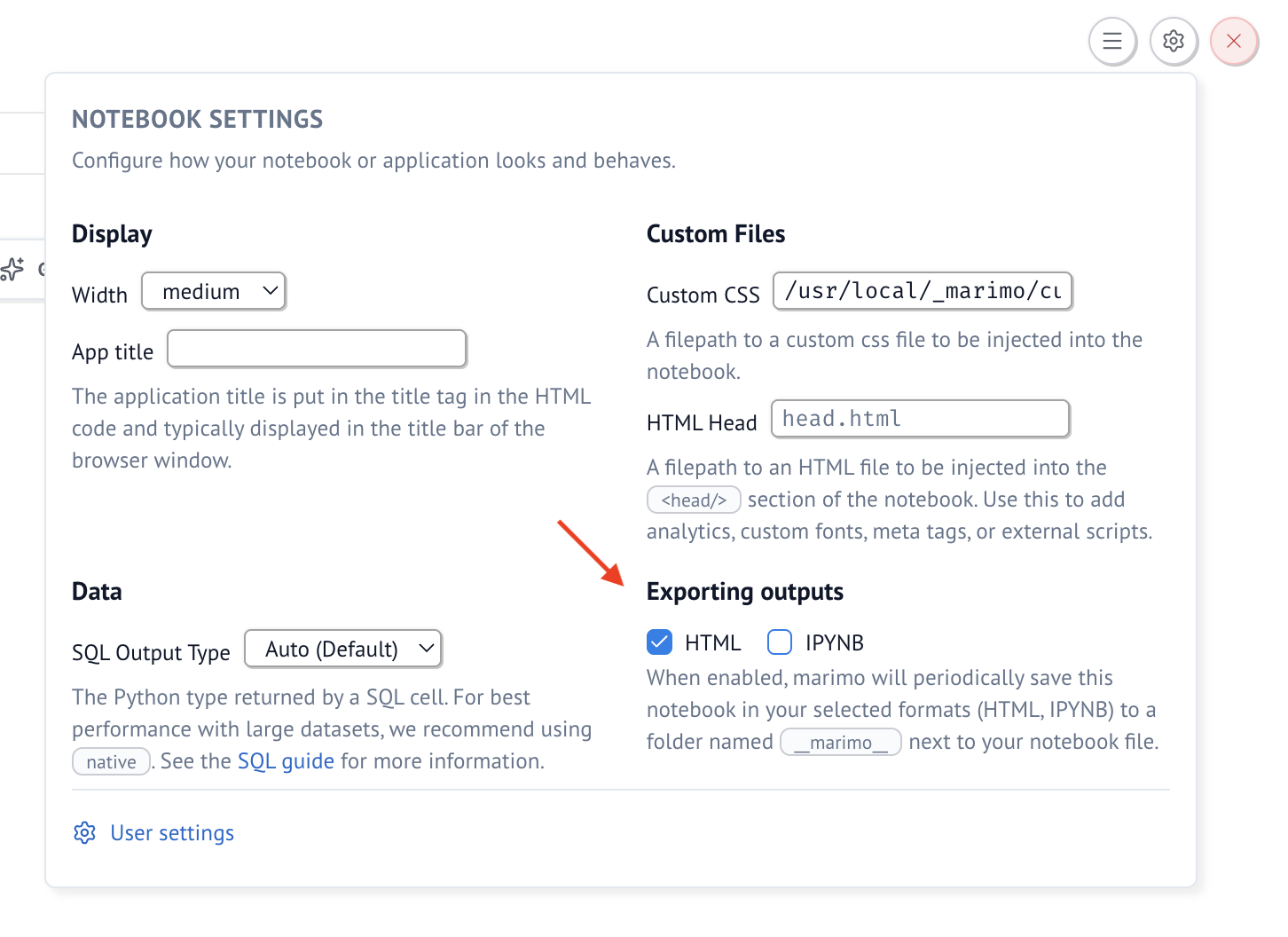 Additionally, you can configure individual notebooks to automatically save as HTML through the notebook menu. These automatic snapshots are saved to a folder called __marimo__ in the notebook directory.